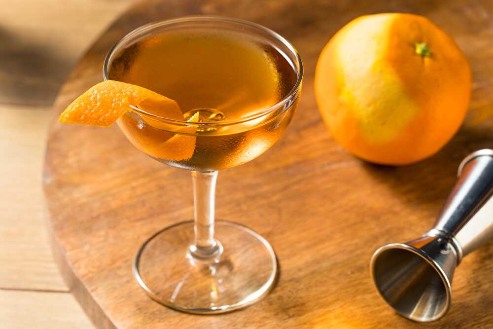 1. 将所有成分倒入装有冰块的混合杯中,搅拌均匀。 2. 过滤到冰镇的鸡尾酒杯中。 3. 用橙皮擦皮屑装饰