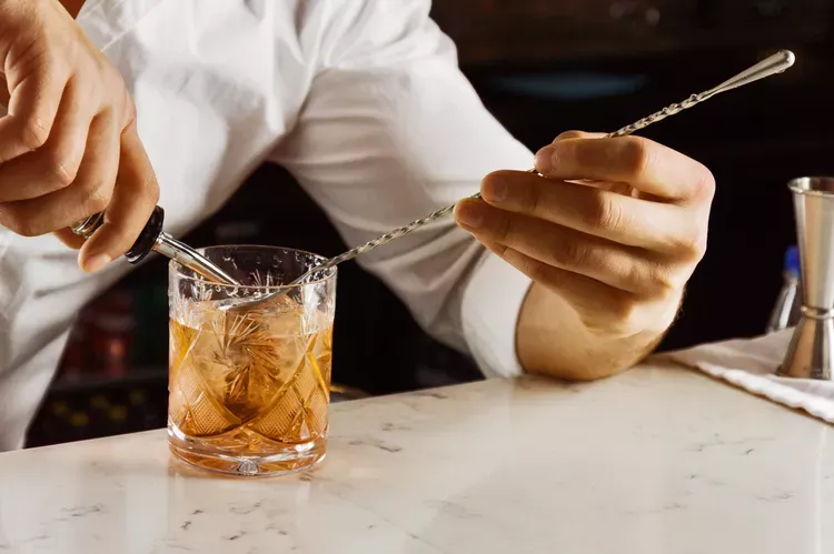 纽约酸的标志性特征是酒面上漂浮的红酒层,这看起来可能有些技术含量,但实际上并不太难操作。(此外,这也是一个很好的方式来利用酒车里剩余的红酒。)小心地将1/2盎司的红酒沿着靠近鸡尾酒表面的调酒勺背面缓缓倒入。正确漂浮的秘密在于各种成分的密度。糖浆中的糖分有助于保持波本威士忌基底的重量,而酒精含量较高的红酒因其较轻的密度而能够漂浮在表面。